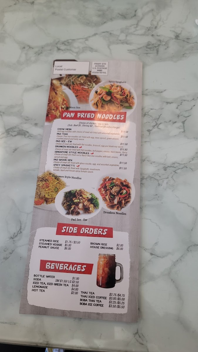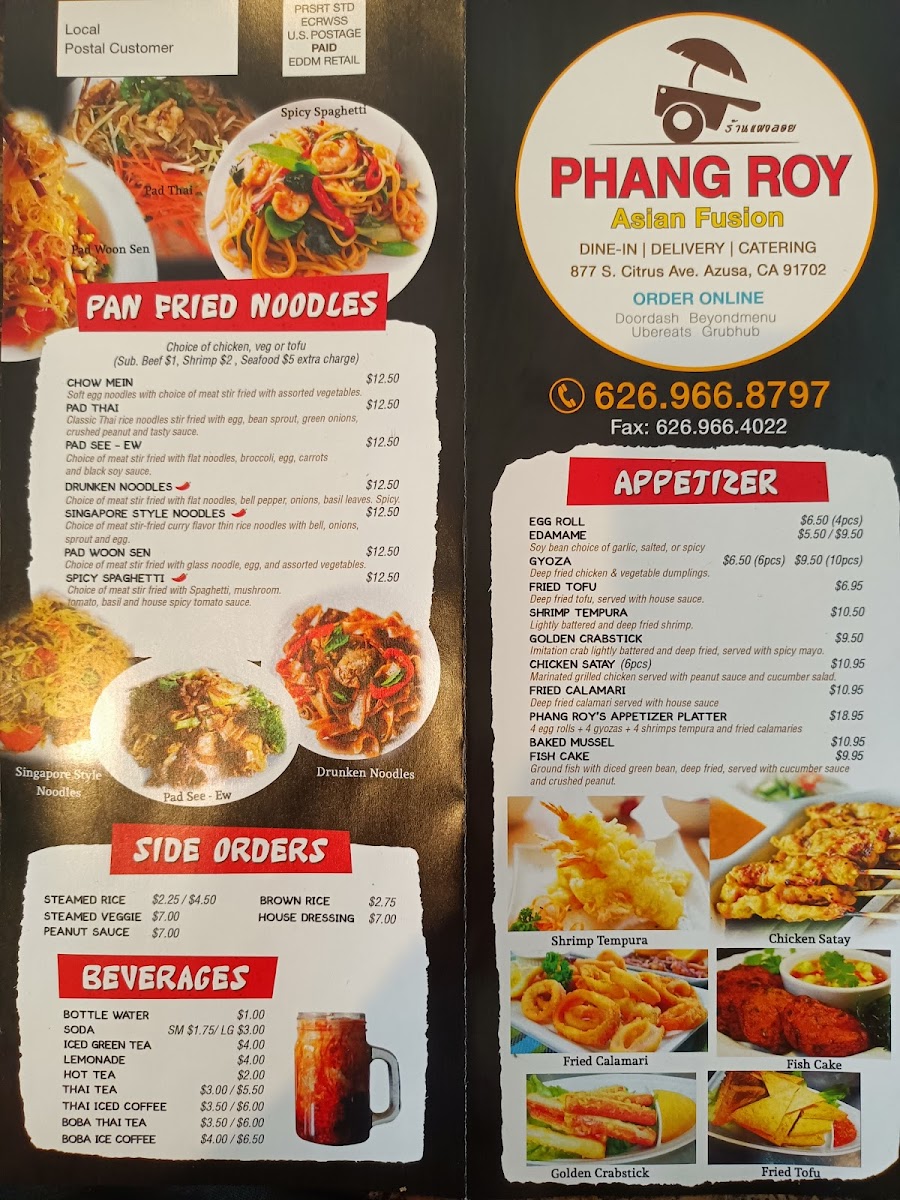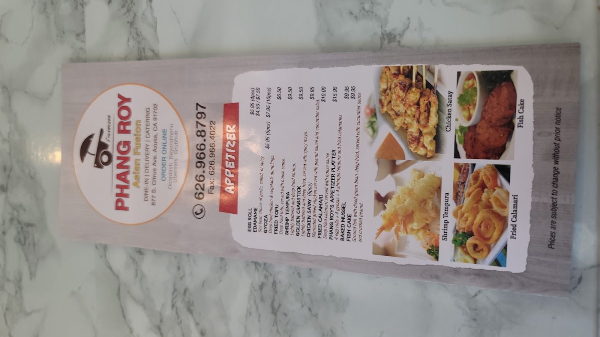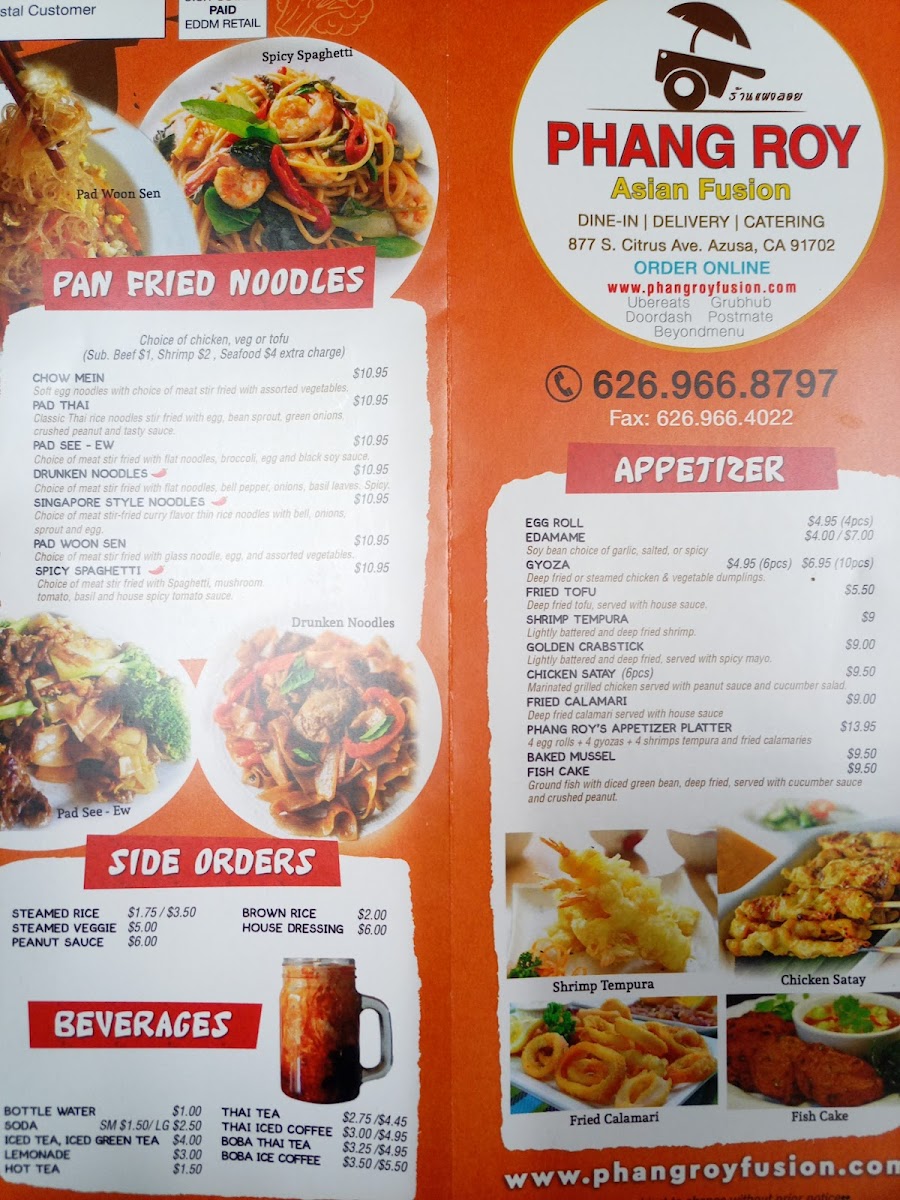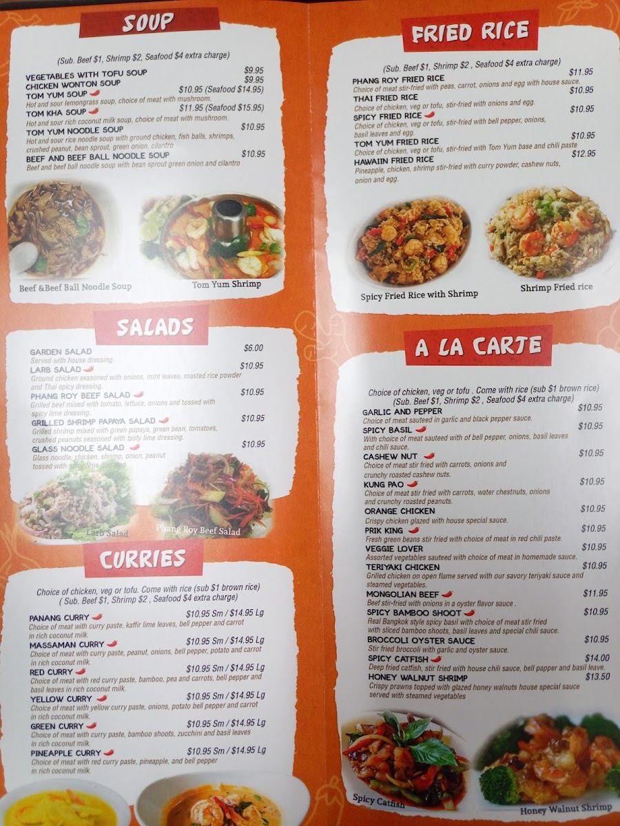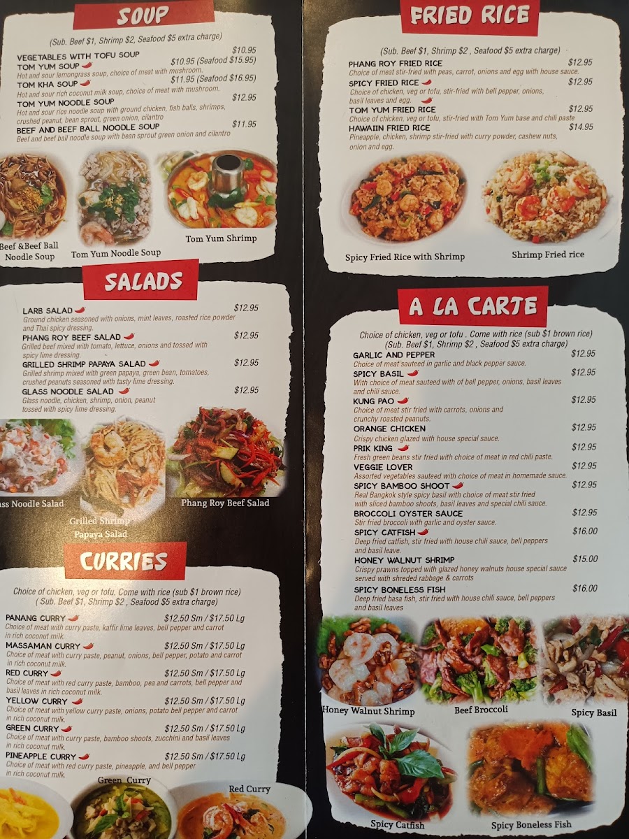 The menu at Phang Roy Thai Cuisine offers a delightful variety of appetizers, salads, and soups that highlight the rich flavors of Thai cuisine. For starters, the Eggrolls (4pcs), Edamame, and Gyoza are perfect for sharing, while the Cream Cheese Wonton and Fried Tofu add a crispy, savory touch. The salads are equally diverse, with options like the fresh Garden Salad, the flavorful Larb Salad, and the tangy Grilled Shrimp Papaya Salad. For something more substantial, the Phang Roy Beef Salad and Glass Noodle Salad stand out with their bold flavors. The soup section includes comforting choices such as the classic Chicken Wonton Soup, the light Vegetable Tofu Soup, and the aromatic Tom Yum Soup. For those who love seafood, the Tom Yum Soup with Seafood and the creamy Tom Kha Soup are must-tries. Each dish is crafted with attention to flavor, offering a satisfying range of choices for every palate.